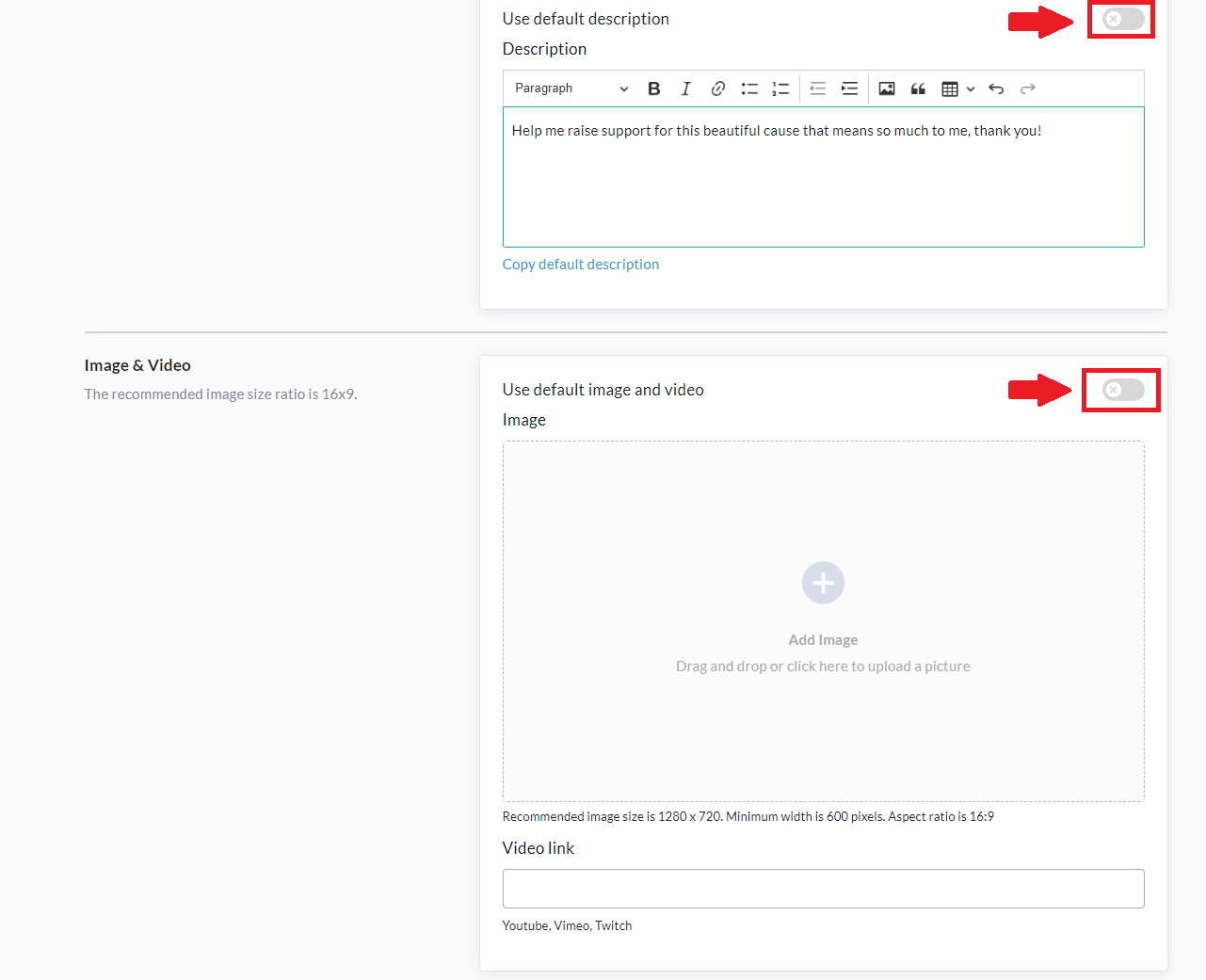 They will then be prompted to enter their Team Name, Fundraising Goal, and if desired, they can add their own image, video, or text description, by turning OFF these toggle switches: