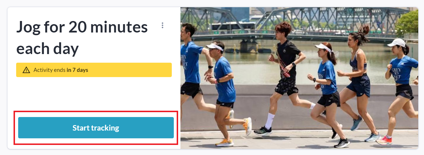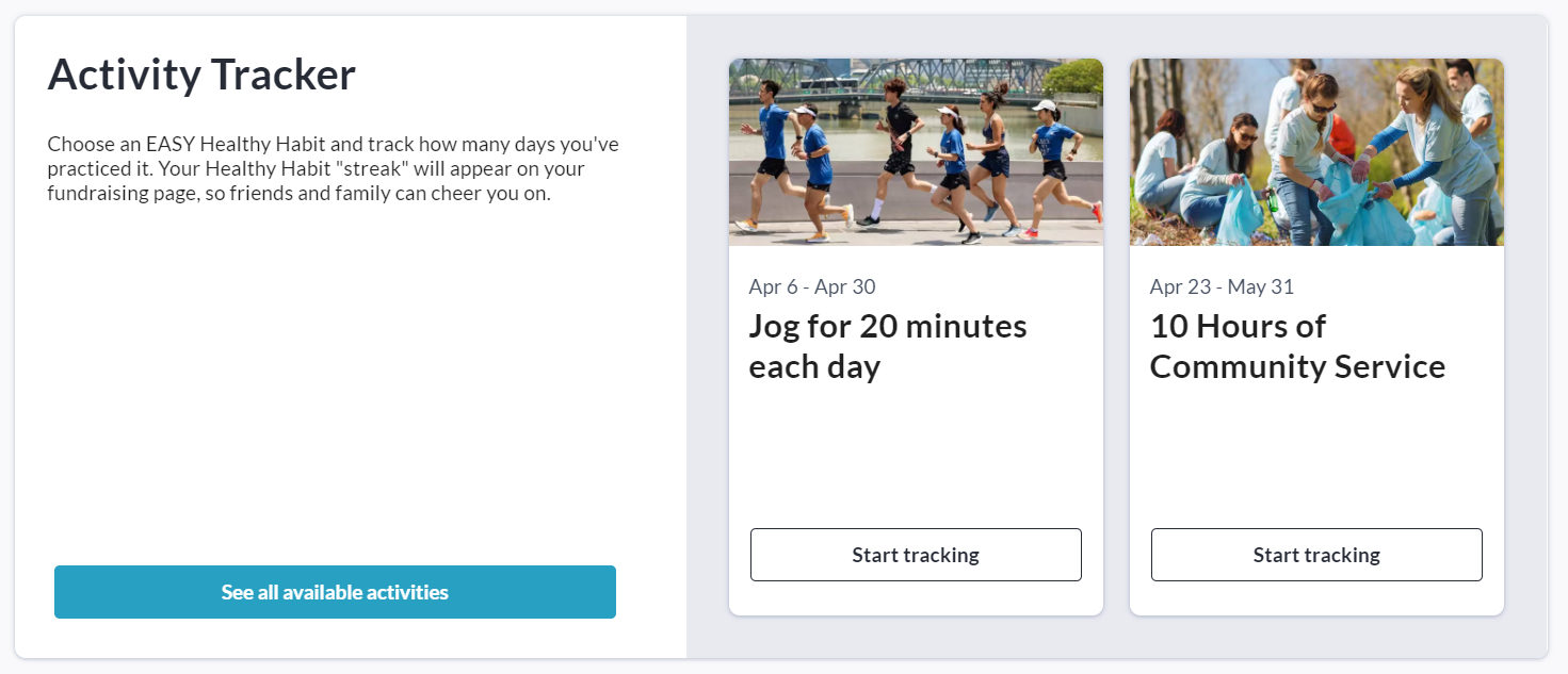 If you clicked See all available activities, click the Start Tracking button on the specific activity you would like to track progress towards. You may only track one activity at a time.