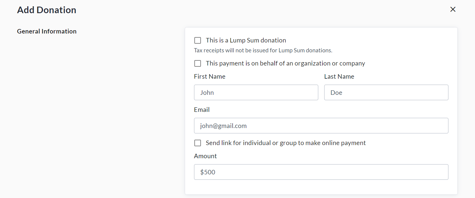 Within General Information, enter your donor’s first and last name, email address, and donation amount.