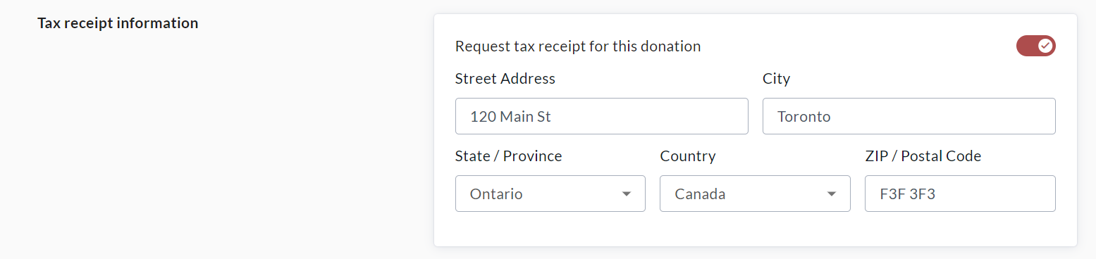 If a tax receipt is desired for this donation, within Tax Receipt Information, enable Request tax receipt for this donation and enter the donor’s address & postal code.