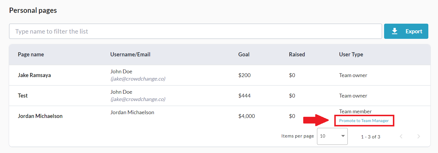 Scroll down to the Personal Pages section and click Promote to Team Manager for a team member you would like to make the Team Manager.
