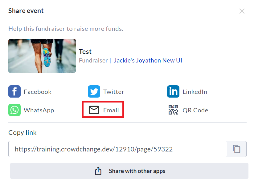Step 1: Once participants create their personal fundraising pages, they can share directly to social media using the Share button. Mass emails can also be sent using the Mailing List, which can be accessed by clicking the email icon within the Share menu (below). For steps on using the Mailing List, please see Step 2.