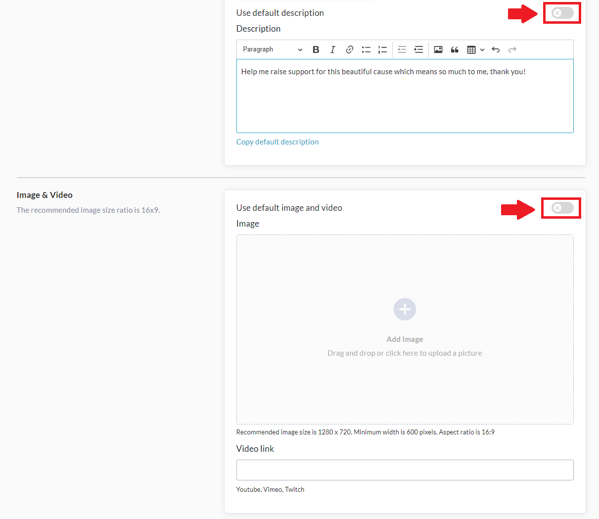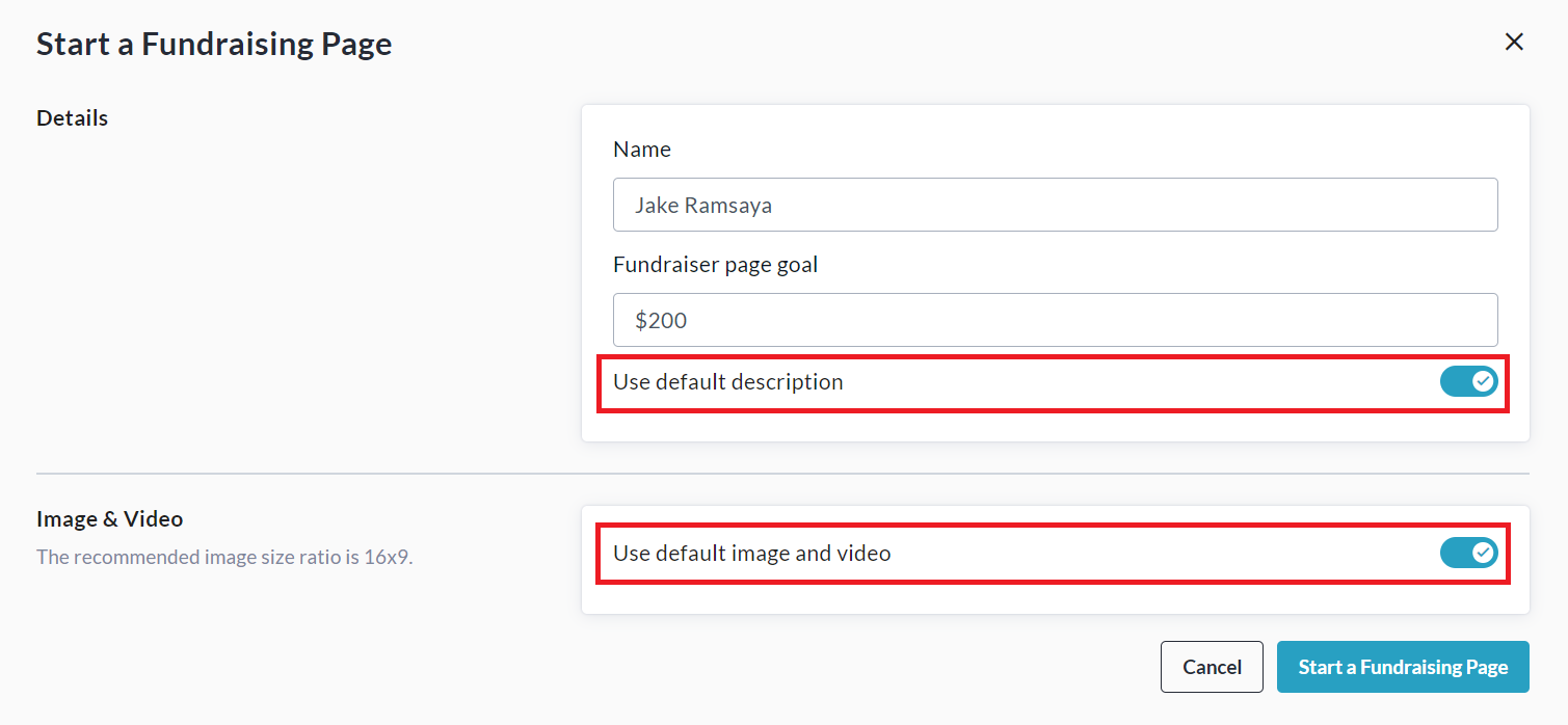 Participants will then be prompted to enter their Name and Fundraising Goal for the page. If desired, they can also add their own image, video, or text description, by turning OFF the following toggles: