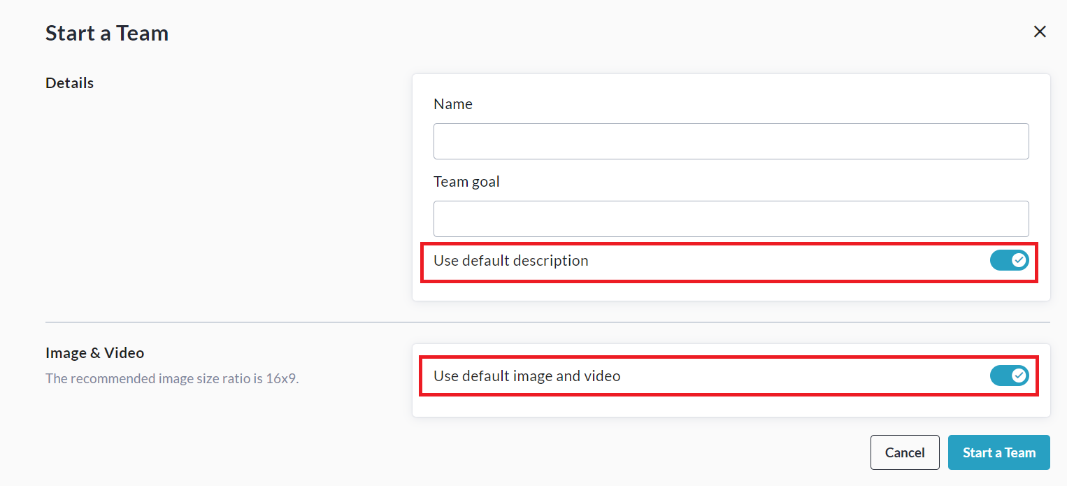 They will then be prompted to enter their Team Name, Fundraising Goal, and if desired, they can add their own image, video, or text description, by turning OFF these toggle switches: