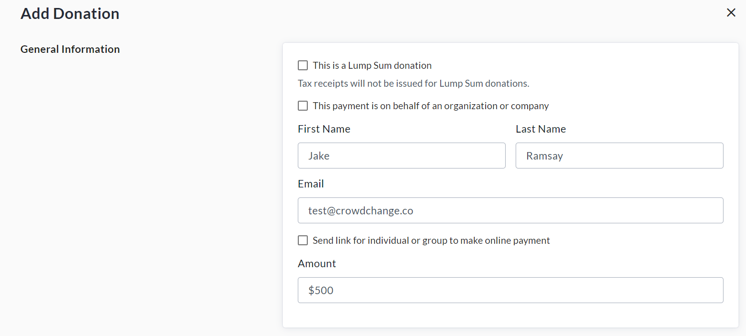 2. Click Add Donation and enter the donor’s details. Enter Tax Receipt Information if necessary.