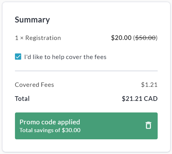 Promo Codes can be applied to Tickets, Merchandise and/or Registrations.