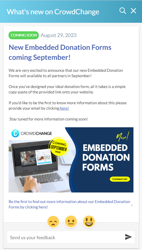 This will bring up the ‘What’s New on CrowdChange' tab, where you will see each announcement listed.
